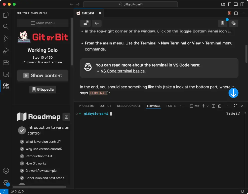 Terminal looks too big? For the best experience, I recommend making it a quarter of the editor's height. You can resize it by dragging the border between the editor and the terminal. By the way, you can resize the sidebar in the same way!